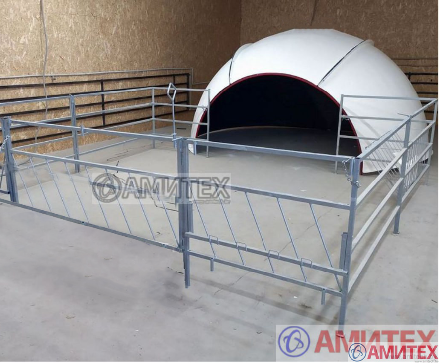 Домики могут быть использованы как крытое сооружение для выпаса животных, или как открытый манеж в комплекте с металлическим ограждением из оцинкованной стали со съемными передними воротами, вентиляционными отверстиями, держателями для воды и яслями для сена.